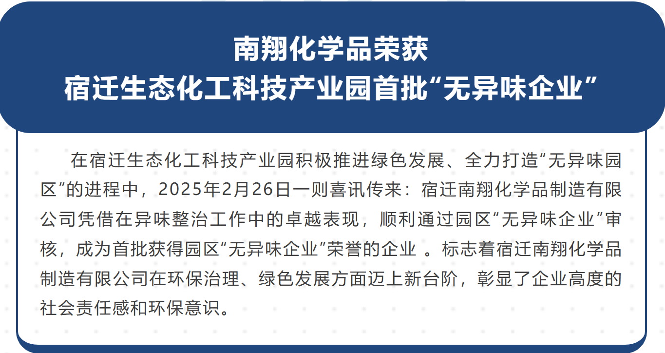 此次榮獲園區(qū)“無(wú)異味企業(yè)”的稱號(hào),是對(duì)公司長(zhǎng)期以來(lái)堅(jiān)持綠色發(fā)展的充分肯定, 也將激勵(lì)企業(yè)繼續(xù)踐行環(huán)保責(zé)任,為建設(shè)美麗園區(qū)貢獻(xiàn)力量。宿遷南翔化學(xué)品制造有限公司將以此為契機(jī),不斷提升環(huán)保管理水平,持續(xù)改進(jìn)生產(chǎn)工藝,努力打造資源節(jié)約型、環(huán)境友好型企業(yè),為實(shí)現(xiàn)高質(zhì)量,可持續(xù)發(fā)展目標(biāo)而不懈奮斗!